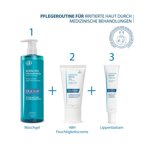 Die Keracnyl REPAIR Creme ist eine nährende und feuchtigkeitsspendende Pflege, die die ausgetrocknete Haut durch eine orale Aknebehandlung optimal mit Lipiden und Feuchtigkeit versorgt.