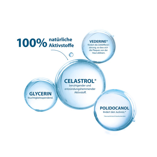 Die Formel des Feuchtigkeitsbalsams kombiniert aktive Inhaltsstoffe wie Polidocanol und Celastrol®. Polidocanol ist wirksam gegen Juckreiz, während Celastrol® neben ebenfalls juckreizlindernden auch entzündungshemmende Eigenschaften besitzt. Vederine®, pflanzlich gewonnen, kann das Auftreten neuer Psoriasis-Plaques reduzieren. Diese Inhaltsstoffe tragen dazu bei, die durch Hauttrockenheit verursachten Beschwerden zu lindern und das Wohlgefühl zu verbessern.