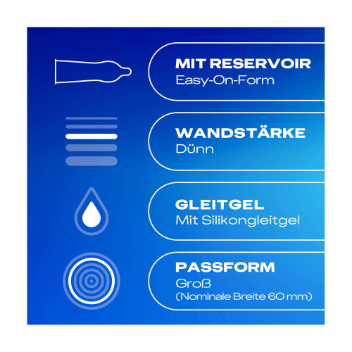 Denke daran, dass keine Verhütungsmethode zu 100 % vor Schwangerschaft, HIV oder sexuell übertragbaren Krankheiten schützt. Es ist gut, Bescheid zu wissen – deshalb beachte bitte die Informationen auf der Innenseite der Packung, insbesondere, wenn du Kondome für Anal- oder Oralsex benutzt.