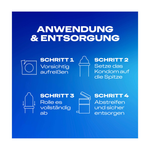 Bitte beachte die Informationen auf der Innenseite der Packung, insbesondere, wenn du Kondome für Anal- oder Oralsex benutzt. Denke daran, dass keine Verhütungsmethode zu 100 % vor Schwangerschaft, HIV oder sexuell übertragbaren Krankheiten schützt. Kondome können eine Erstickungsgefahr darstellen. Außerhalb der Reichweite von Kindern aufbewahren. Überprüfe vor der Verwendung das Verfallsdatum auf der Verpackung. Ist die Kondomfolie offensichtlich beschädigt, wirf das Kondom weg und benutze ein neues aus einer unbeschädigten Verpackung. Benutze jedes Kondom nur einmal. Eine Wiederverwendung erhöht das Risiko einer Beschädigung oder Infektion.