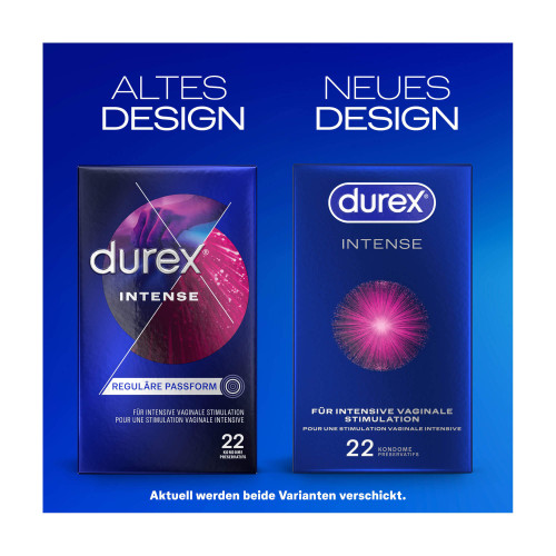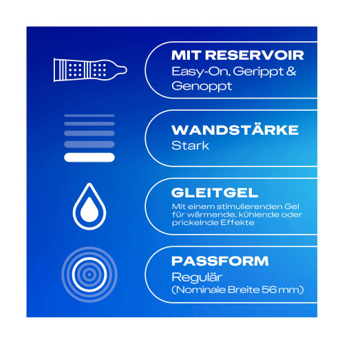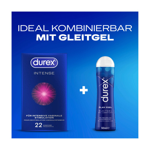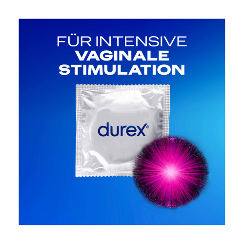 Die Durex Intense Kondome sind für zusätzliche vaginale Stimulation gemacht. Die gerippte und genoppte Textur sorgt für ein noch intensiveres Gefühl und das stimulierende Gel erzeugt wärmende, kühlende oder prickelnde Effekte. Sie haben eine nominale Breite von 56 mm (reguläre Passform) und sind mit viel Desirex-Gel befeuchtet – so wird der Sex für euch noch prickelnder und angenehmer. Die Durex Intense Kondome sind für alle Personen geeignet, die zusätzliche Stimulation beider Partner möchten. Die anatomische Easy-On-Form mit Reservoir sorgt für einen komfortablen Sitz.