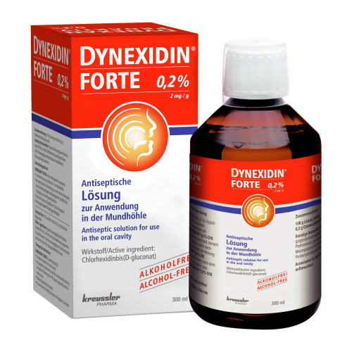Dynexidin Forte 0,2% 2 mg/g Lösung. Wirkstoff: Chlorhexidinbis(D-gluconat). Anwendungsgebiete: Zur Verminderung von Bakterien in der Mundhöhle; als unterstützende Behandlung zur mechanischen Reinigung bei bakteriell bedingten Entzündungen des Zahnfleisches und der Mundschleimhaut sowie nach chirurgischen Eingriffen am Zahnhalteapparat.
