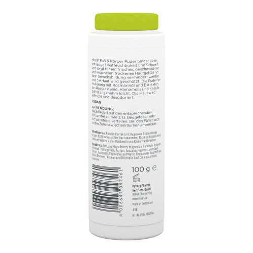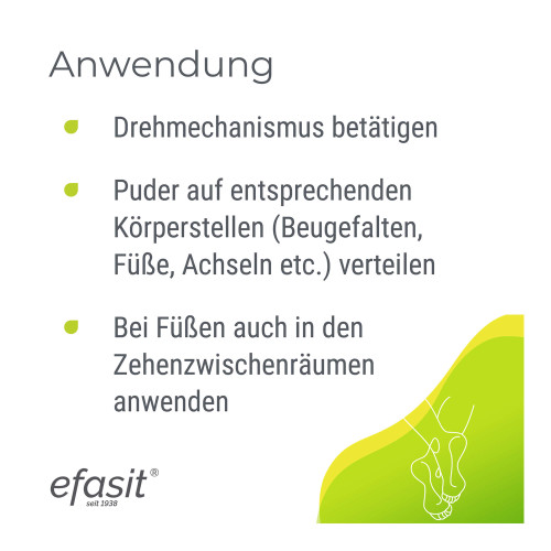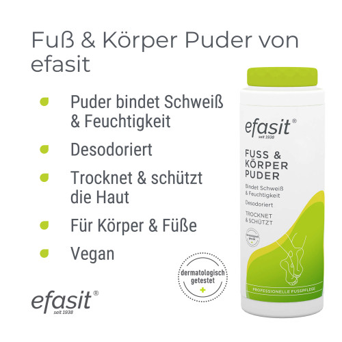 efasit Fuß & Körper Puder bindet überschüssige Hautfeuchtigkeit sowie Schweiß und sorgt für ein frisches, geschmeidiges und angenehm trockenes Hautgefühl. So kann Geruchsbildung vermindert werden und die Haut wird geschützt. Die Puderformulierung mit Rosmarinöl und Extrakten aus Rosskastanie, Hamamelis und Kamille duftet angenehm leicht. Die Haut wird erfrischt und desodoriert.