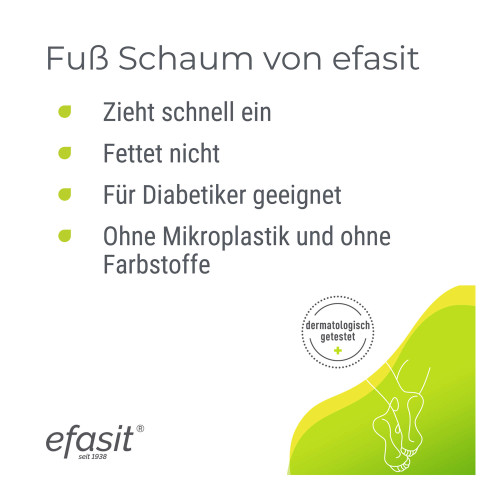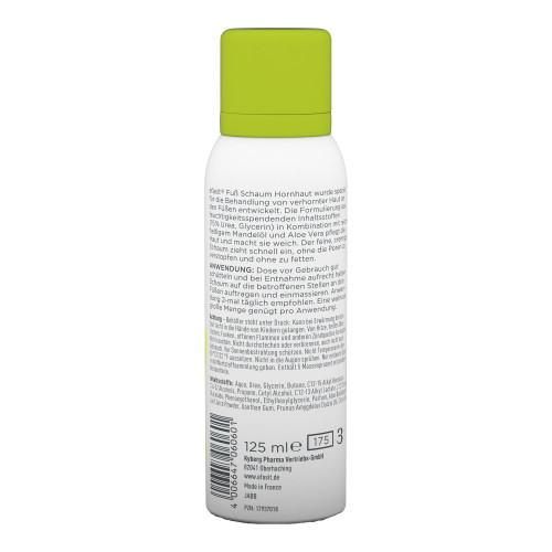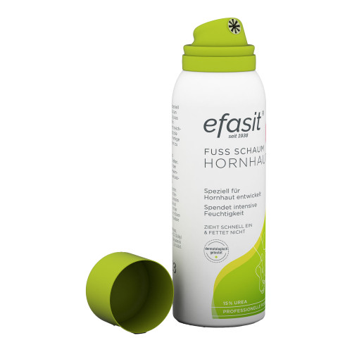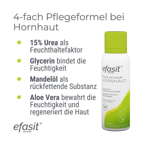 efasit® Fuß Schaum Hornhaut wurde speziell für die Pflege verhornter Stellen am Fuß entwickelt. Mit einem hohen Anteil an Urea und hydratisierendem Glycerin wird die Haut intensiv mit Feuchtigkeit versorgt. Des Weiteren beinhaltet der Fußpflege-Schaum reichhaltiges Mandelöl und Aloe Vera, welche die beanspruchte Fuß-Haut pflegen und regenerieren. Zudem macht die schaumige Textur dieses Produkt zu einem ganz besonderen Pflegeerlebnis für die Füße.