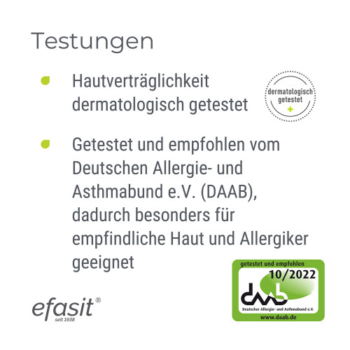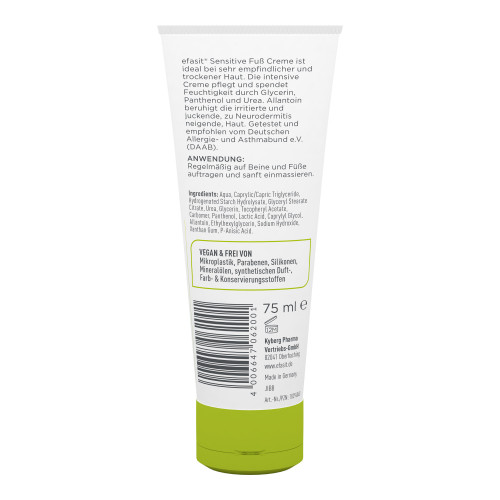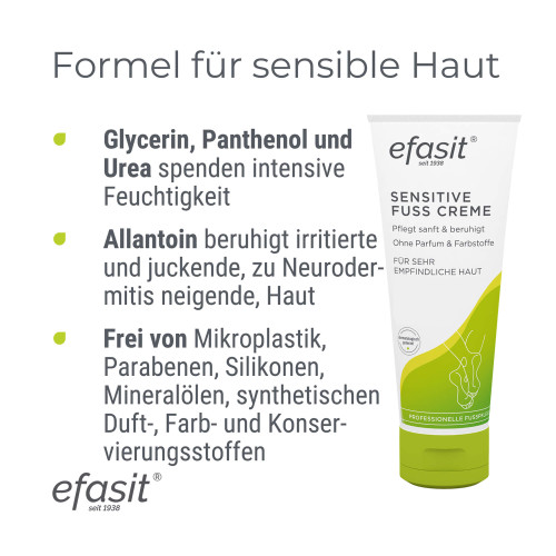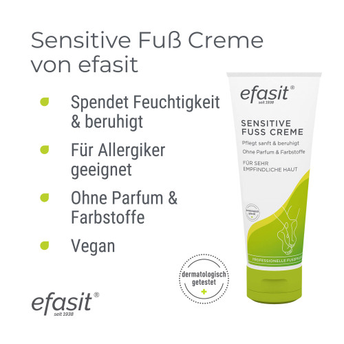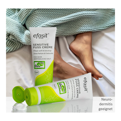 efasit Sensitive Fuß Creme ist ideal bei sehr empfindlicher und trockener Haut. Die intensive Creme pflegt und spendet Feuchtigkeit durch Glycerin, Panthenol und Urea. Allantoin beruhigt die irritierte und juckende, zu Neurodermitis neigende, Haut. Getestet und empfohlen vom Deutschen Allergie- und Asthmabund e.V. (DAAB).