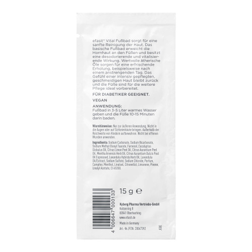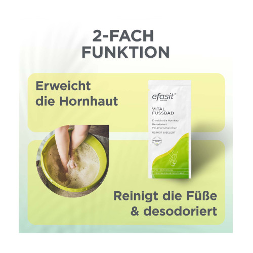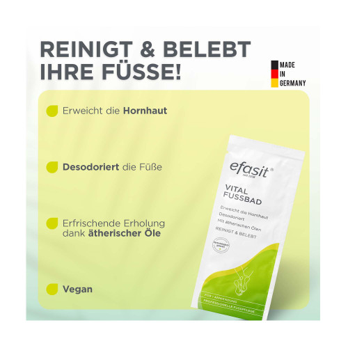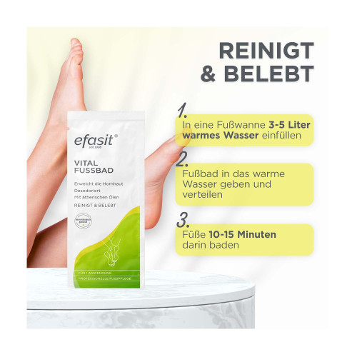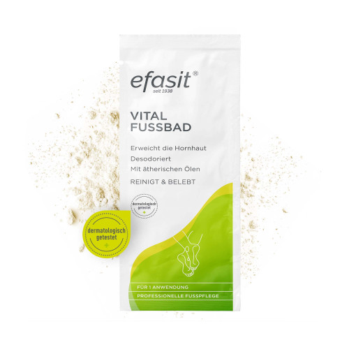 Das efasit Vital Fußbad ist der perfekte Badezusatz und sorgt für eine sanfte Reinigung der Füße. Das basische Fußbad erweicht die Hornhaut und besitzt eine desodorierende und vitalisierende Wirkung. Dadurch kann das Fußbad auch gegen Schweißfüße angewendet werden. Wertvolle ätherische Öle sorgen für eine erfrischende Erholung, z.B. nach einem anstrengenden Tag. Müde und beanspruchte Füße werden vitalisiert. Das Gefühl einer intensiv gepflegten, geschmeidigen Haut bleibt zurück und die Füße sind für die weitere Pediküre ideal vorbereitet.