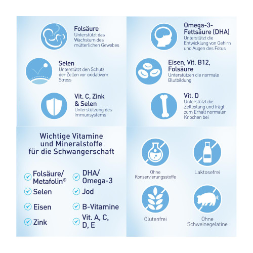 Fischölkonzentrat mit Omega-3-Fettsäure-Ethylestern; Gelatine; Ascorbinsäure; Feuchthaltemittel Glycerin; Magnesiumoxid; Verdickungsmittel Bienenwachs, gelb; Eisenfumarat; Verdickungsmittel Siliciumdioxid; Nicotinamid, DL-alpha-Tocopherylacetat; Zinkoxid; Calcium-D-Pantothenat; Beta-Carotin; Farbstoff Eisenoxide und Eisenhydroxide; Kupfersulfat; Pyridoxinhydrochlorid; Thiaminmononitrat; Riboflavin; Pteroylmonoglutaminsäure; Calcium-L-methylfolat, Cholecalciferol; Kaliumiodat; Natriumselenit; D-Biotin; Cyanocobalamin; Emulgator Lecithine (Soja).