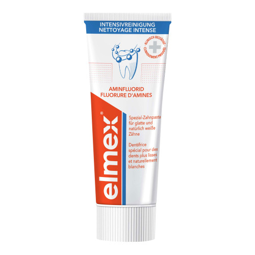 elmex® INTENSIVREINIGUNG ist eine Spezialzahnpasta gegen Verfärbungen. Sie hilft die natürliche Zahnfarbe zu erhalten und sorgt dank spezieller Putzkörper für spürbar saubere und glatte Zähne. Besonders effektiv ist der Einsatz nach der professionellen Zahnreinigung (PZR).