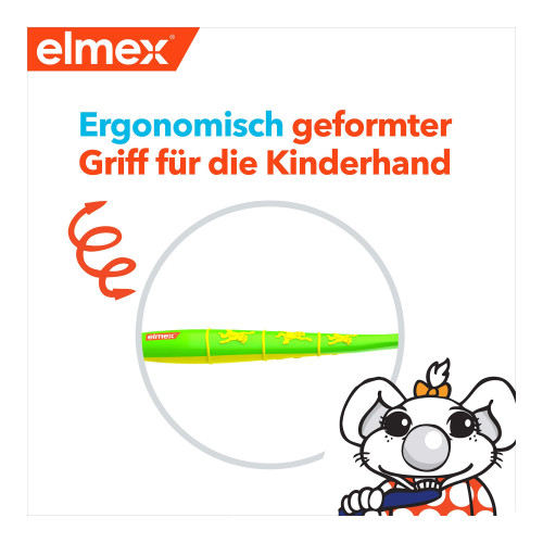 Um die ersten eigenen Putzversuche zu fördern, sollten Sie Ihrem Kind eine auf seine motorischen Fähigkeiten angepasste Zahnbürste geben. Die elmex Kinder-Zahnbürste unterstützt Kinder beim spielerischen Erlernen des Zähneputzens. Kleiner Bürstenkopf speziell angepasst an den Mund von Kindern von 2-6 Jahren. Blaues Borstenfeld erleichtert die Dosierung der erbsengrossen Menge Kinder-Zahnpasta. Weiche, abgerundete Borsten gewährleisten eine schonende Reinigung der Milchzähne. Ergonomisch geformter Griff mit Führungslinien geeignet für alle von Kindern verwendeten Griffarten. Mit Saugnapf für eine einfache, spaßige und aufrechte Aufbewahrung.