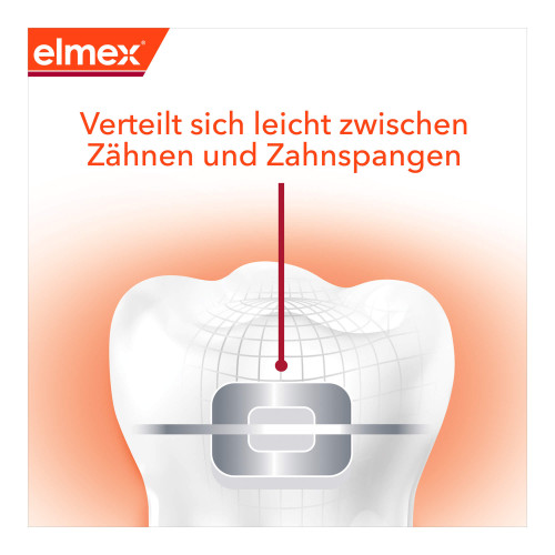 Die elmex KARIESSCHUTZ PROFESSIONAL + ZAHNSPANGE Zahnpasta reguliert den pH-Wert in der Plaque, bevor Zuckersäuren die Zähne angreifen und Karies verursachen können. Zudem verteilt sich die Zahnpasta leicht zwischen Zähnen und Zahnspangen, um auch schwer zugängliche Stellen zu remineralisieren.