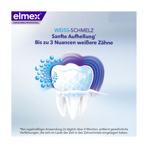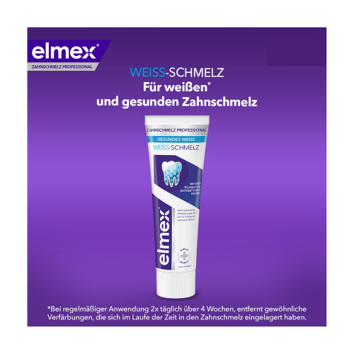 Mit elmex® Zahnschmelz Professional Weiss-Schmelz Zahnpasta können Sie gewöhnlichen Verfärbungen, die sich im Laufe der Zeit in den Zahnschmelz eingelagert haben bei regelmäßiger 2x täglicher Anwendung über 4 Wochen entfernen und Ihren Zahnschmelz vor Mineralien-Abbau und Karies schützen.