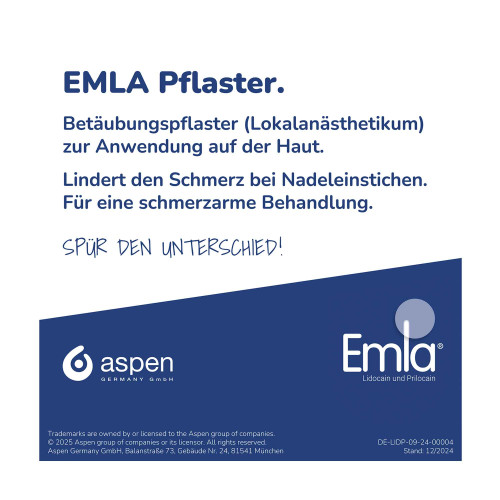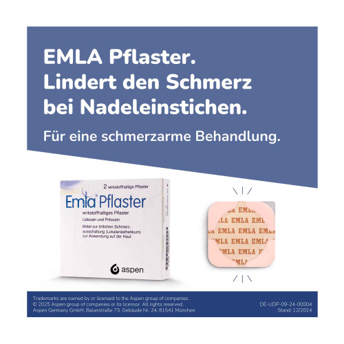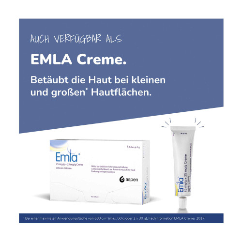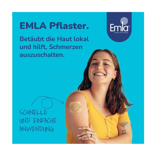 Emla Pflaster, wirkstoffhaltiges Pflaster. Anwendungsgebiete: Zur Betäubung der Haut vor einem Nadeleinstich (z. B. wenn Sie eine Injektion bekommen oder zur Blutabnahme); kleineren operativen Eingriffen an der Haut. Warnhinweis: Enthält Macrogolglycerolhydroxystearat (Ph.Eur.).