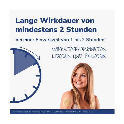 - Bei Erwachsenen und Jugendlichen über 12 Jahren wird Emla Pflaster mindestens 60 Minuten vor dem Eingriff aufgebracht. Bringen Sie es jedoch nicht mehr als 5 Stunden vor dem Eingriff auf.