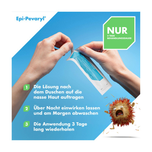 Duschen Sie zunächst die Haare und den ganzen Körper. Tragen Sie danach Epi-Pevaryl P.v. 1 % Lösung auf die feuchte Kopfhaut, die noch feuchten, befallenen Körperstellen sowie auf den restlichen Körper auf. Vergessen Sie dabei nicht die Achselhöhlen, Hautfalten und Zehenzwischenräume. Lassen Sie sich den Rücken möglichst von einer zweiten Person behandeln.
