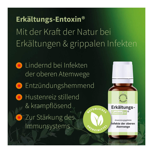 Erkältungs-Entoxin, Mischung. Anwendungsgebiete: Die Anwendungsgebiete leiten sich von den homöopathischen Arzneimittelbildern ab. Dazu gehören: Besserung der Beschwerden bei Infekten der oberen Atemwege. Warnhinweis: Enthält 50,6 Vol.-% Alkohol!