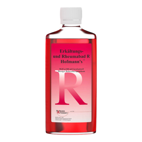 Erkältungs- und Rheumabad R Hofmann's, Badezusatz zur Anwendung bei Badebehandlungen (Balneotherapeutikum). Wirkstoff: Eucalyptusöl. Anwendungsgebiete: Zur unterstützenden Behandlung von akuten und chronischen Katarrhen der Luftwege und zur unterstützenden Behandlung rheumatischer Beschwerden.