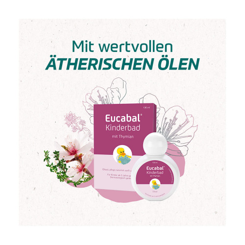 Eucabal® Kinderbad mit Thymian wurde sorgfältig auf die speziellen Bedürfnisse von Kindern abgestimmt. Die enthaltenen Öle pfl egen besonders zarte Kinderhaut auf natürliche Weise. Eucabal® Kinderbad mit Thymian wurde dermatologisch getestet und enthält ausschließlich Substanzen, die für kosmetische Produkte in besonderem Maße geeignet sind.