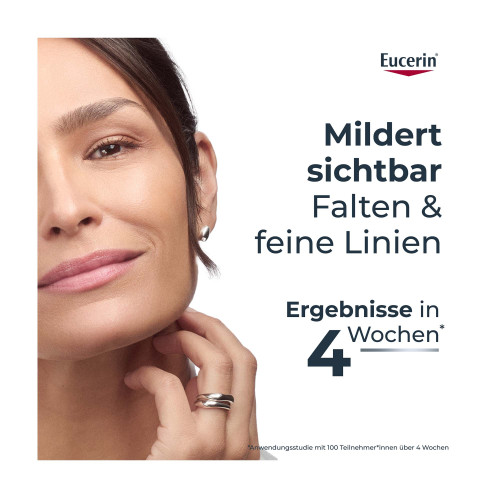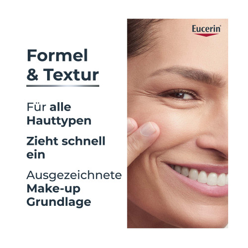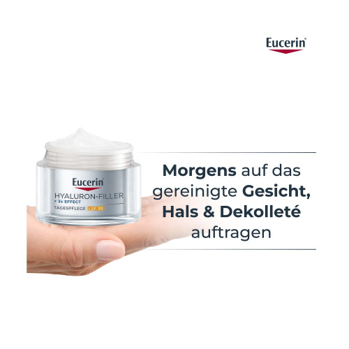 Die Eucerin® Hyaluron-Filler + 3x Effect Tagespflege LSF 30 50 ml mildert selbst ausgeprägte Falten, strafft die Haut sichtbar und spendet intensive Feuchtigkeit. Mit zunehmendem Alter nimmt die hauteigene Produktion von Hyaluronsäure und Kollagen ab. Die Haut verliert an Spannkraft und es bilden sich Falten. Die Anti Age Gesichtspflege wirkt dank ihrer innovativen Formel mit Hyaluronsäure und Glycin-Saponin dem Alterungsprozess entgegen und lässt die Haut insgesamt jünger und strahlender aussehen. Hochdosierte Hyaluronsäure versorgt die Haut mit Feuchtigkeit und mildert Falten, während antioxidatives Glycin-Saponin die hauteigene Produktion von Hyaluronsäure und Kollagen aktiviert.