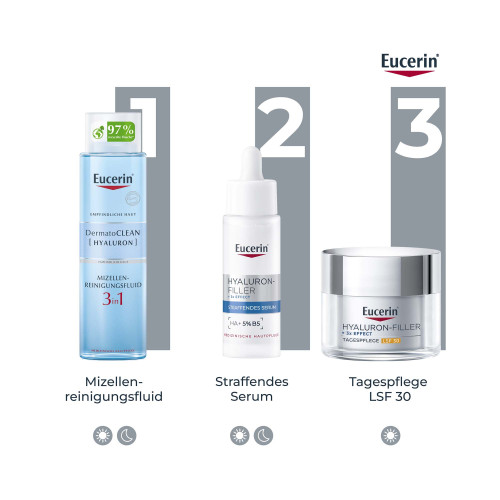Für ein besonders straffes Hautbild das Eucerin® Hyaluron-Filler + 3x Effect Straffendes Serum sowie die Hyaluron-Filler + 3x Effect Straffende Nachtpflege am Abend anwenden.