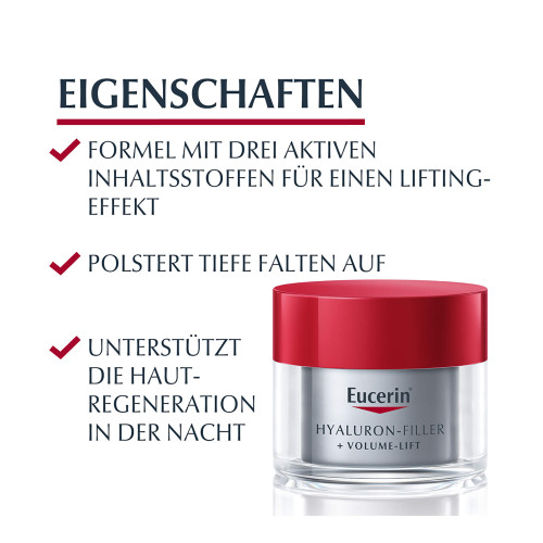 Die Eucerin Hyaluron-Filler Nachtpflege unterstützt den Regenerationsprozess der Gesichtshaut während der Nacht und wirkt mit vier aktiven Inhaltsstoffen als Lifting Creme, die die Haut strafft. Die regenerierende Gesichtscreme wirkt den Ursachen von nachlassendem Hautvolumen entgegen.