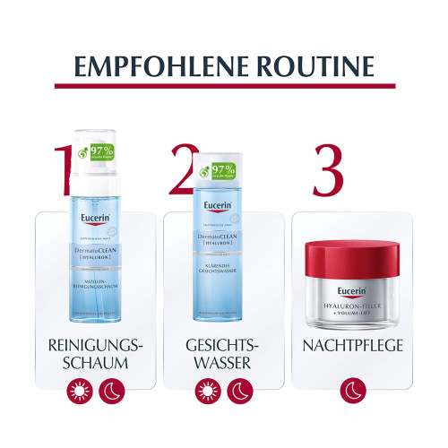 1. Reinigung: Die Haut mit Eucerin DermatoClean [Hyaluron] Mizellen-Reinigungsschaum gründlich reinigen.