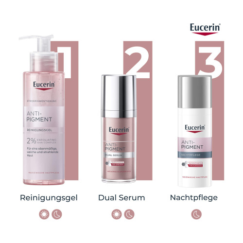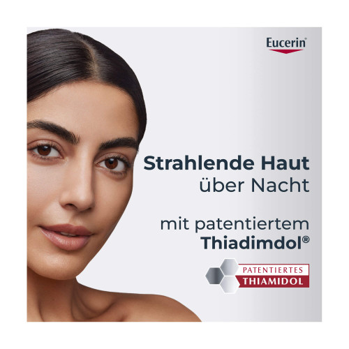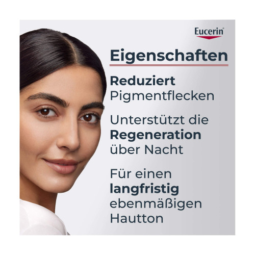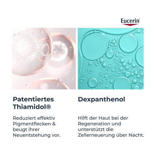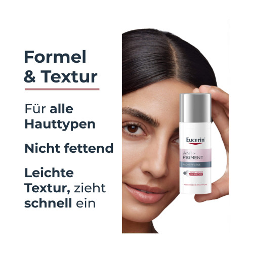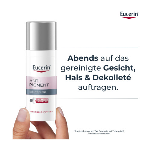 Die Eucerin® Anti-Pigment Nachtpflege enthält den effektiven und patentierten Pflegewirkstoff Thiamidol®. Dieser wirkt von Tag 1 an auf die Melaninproduktion an ihrem Ursprung ein und lässt Pigmentflecken nach und nach verblassen. Bereits nach zwei Wochen sind erste Ergebnisse sichtbar, die sich bei regelmäßiger Anwendung deutlich verbessern. Klinische und dermatologische Studien belegen, dass Pigmentflecken aller Art reduziert und ihrer Neuentstehung vorgebeugt wird.