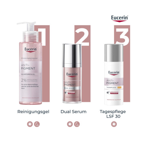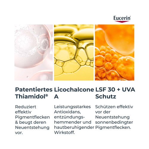 Die Eucerin® Anti-Pigment Tagespflege LSF 30 enthält den effektiven und patentierten Pflegewirkstoff Thiamidol®. Dieser wirkt von Tag 1 an auf die Melaninproduktion an ihrem Ursprung ein und lässt Pigmentflecken nach und nach verblassen. Bereits nach zwei Wochen sind erste Ergebnisse sichtbar, die sich bei regelmäßiger Anwendung deutlich verbessern. Klinische und dermatologische Studien belegen, dass Pigmentflecken aller Art reduziert und ihrer Neuentstehung vorgebeugt wird.