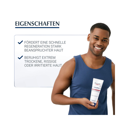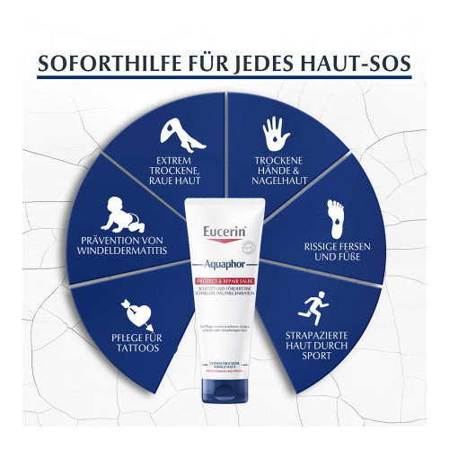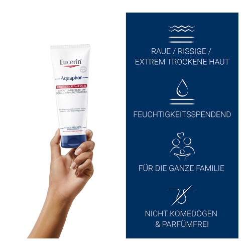 Eucerin Aquaphor Protect & Repair Salbe schützt, beruhigt und pflegt rissige, irritierte extrem trockene Haut und fördert eine schnellere Hautregeneration.