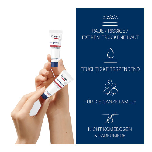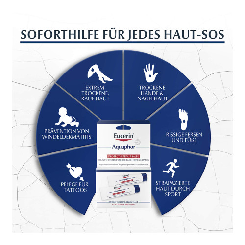 Eucerin Aquaphor Protect & Repair Salbe schützt, beruhigt und pflegt rissige, irritierte extrem trockene Haut und fördert eine schnellere Hautregeneration.