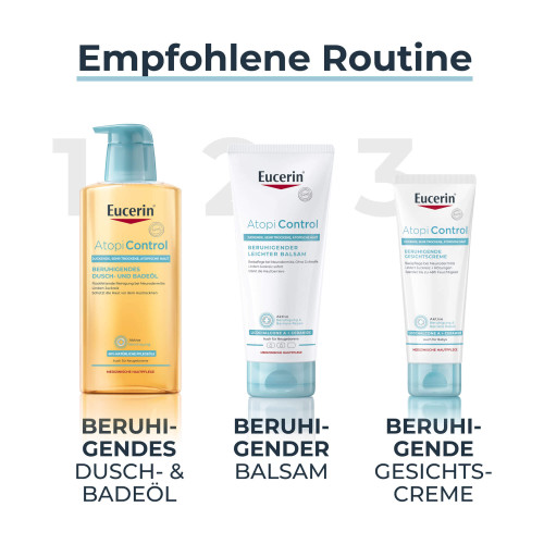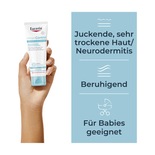 Bei akuten Schüben sollte Eucerin AtopiControl GESICHTSCREME als begleitende kosmetische Pflege neben Eucerin AtopiControl AKUTPFLEGE CREME verwendet werden. Mit Omega-6-Fettsäuren zur Stärkung von trockener, rissiger Haut und dem beruhigenden Licochalcone A ist Eucerin AtopiControl GESICHTSCREME feuchtigkeitsspendend, es beruhigt und glättet raue Haut und lindert Spannung und Juckreiz. Rötungen werden gemindert und die Haut fühlt sich weich und spürbar geschmeidiger an. Dermatologische Studien bestätigen die Eignung für atopische Haut und für die Verwendung bei Kindern und Babys.
