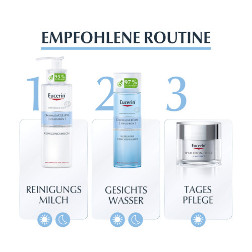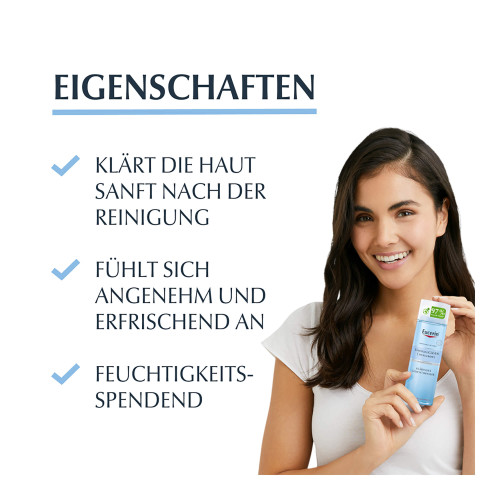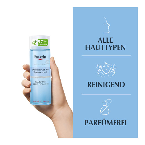 Eucerin DermatoClean [Hyaluron] Klärendes Gesichtswasser ist ein sanftes, aber effektives Gesichtswasser. Es entfernt alle restlichen Spuren der Reinigung und bereitet die Haut auf die nachfolgende Pflege vor.