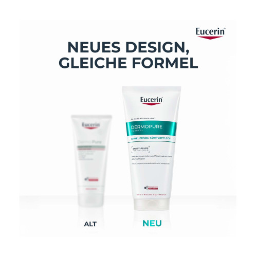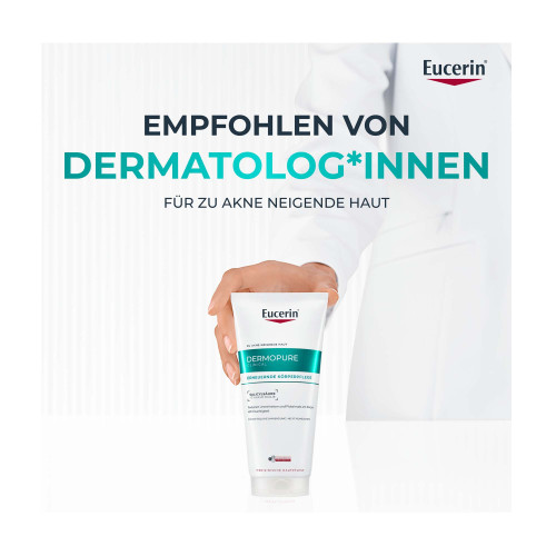 Die Eucerin® DERMOPURE CLINICAL Erneuernde Körperpflege reduziert Unreinheiten und Pickelmale am Körper in nur 2 Wochen*. Die einzigartige Formel kombiniert die aktiven Wirkstoffe Salicylsäure (BHA), Thiamidol® sowie Squalane für ein reineres Hautbild. Zudem wird die Haut bis zu 48h mit Feuchtigkeit versorgt.