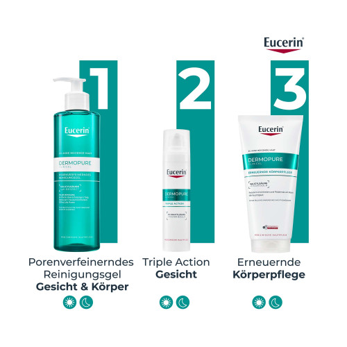 - Für ein reines Hautbild können weitere Produkte aus der Eucerin® DermoPure Clinical Serie ergänzt werden.