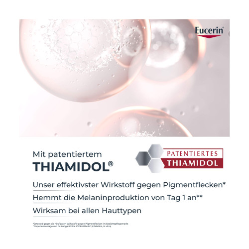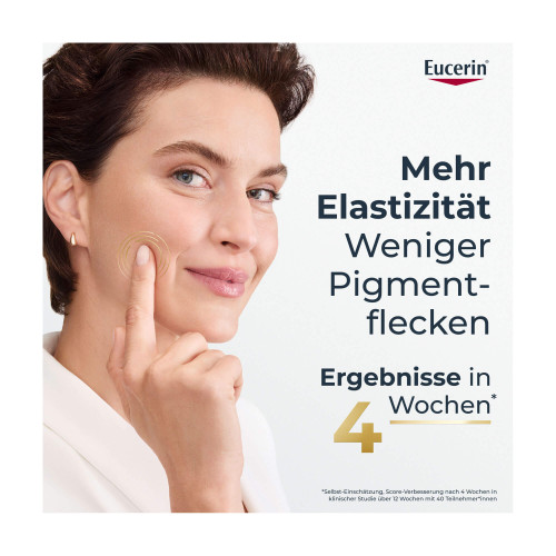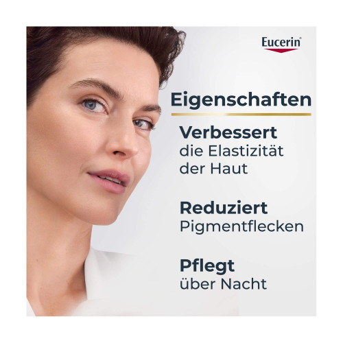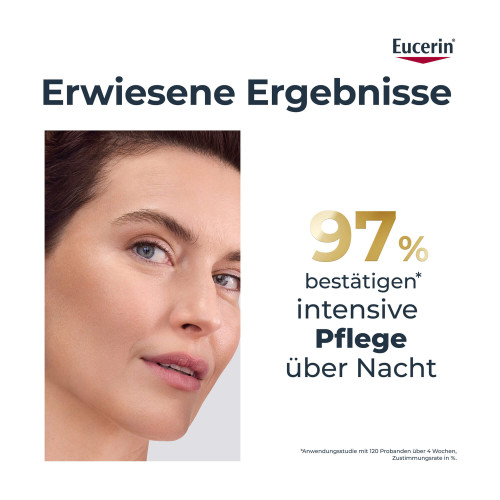 Die innovative Mischung aus hoch- und niedermolekularer Hyaluronsäure von Eucerin polstert tiefe Falten sichtbar auf, während Dexpanthenol den Regenerationsprozess der Haut über Nacht unterstützt. Der neue Kollagen-Elastin-Komplex, eine leistungsstarke Kombination aus Arctiin und Kreatin, regt die Kollagenproduktion an und erhöht die Elastizität der Haut. Das patentierte Thiamidol® von Eucerin mildert Pigmentflecken. Die Haut fühlt sich straff und glatt an und sieht frisch und strahlend aus.