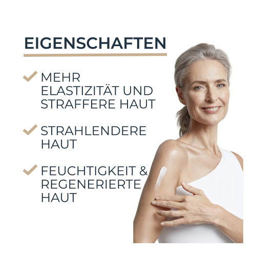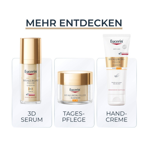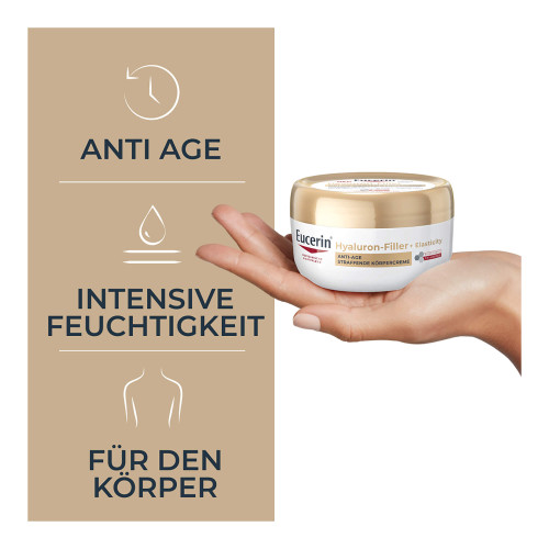 Pflege: Eine dünne Schicht der Eucerin Hyaluron Filler + Elasticity Anti-Age Straffende Körpercreme auftragen und sanft in die Haut einmassieren. Für die besten Ergebnisse täglich morgens und abends anwenden, maximal 2 Anwendungen am Tag. Zusätzlich die Eucerin Hyaluron Filler + Elasticity Anti-Age Handcreme verwenden, um Altersflecken an den Händen zu mildern.