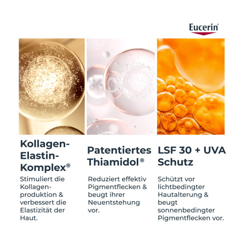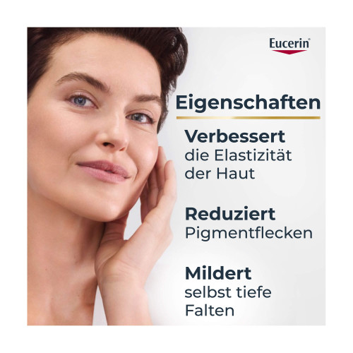 Die einzigartige Formel ist speziell formuliert, um fortgeschrittene Zeichen der Hautalterung zu mildern. Die Kombination aus lang- und kurzkettiger Hyaluronsäure von Eucerin spendet Feuchtigkeit und polstert selbst tiefe Falten sichtbar auf. Der neue Kollagen-Elastin-Komplex, eine leistungsstarke Kombination aus Arctiin und Kreatin, stimuliert die Kollagenproduktion und erhöht die Elastizität der Haut. Das patentierte Thiamidol von Eucerin mildert Pigmentflecken und beugt deren Neuentstehung vor. Für eine sichtbar jünger aussehende, glattere und strahlendere Haut.