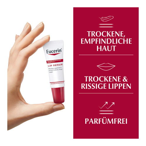 Trockene, empfindliche Haut braucht besondere Pflege. Eucerin® LIP REPAIR wurde von der Eucerin® Hautforschung speziell für die Bedürfnisse empfindlicher, trockener und rissiger Lippen entwickelt.