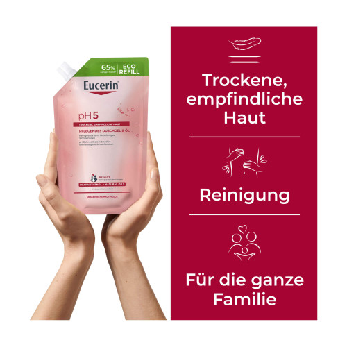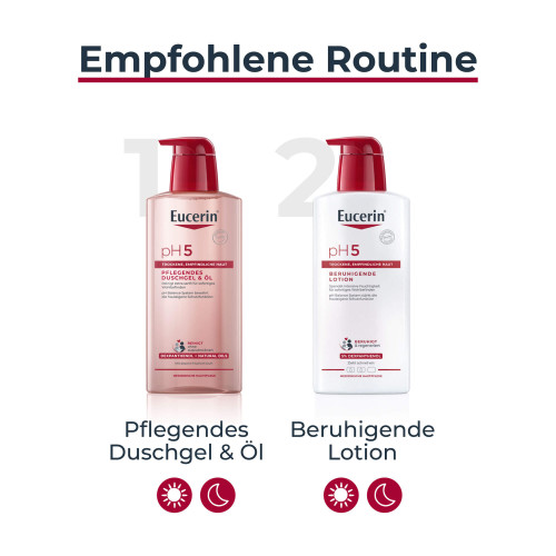 Das Duschgel bei empfindlicher Haut täglich anwenden und die Pflegeroutine mit Eucerin pH5 Pflegeprodukten vervollständigen. Direkten Augenkontakt vermeiden.