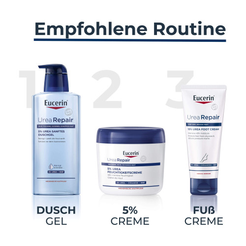 Die UreaRepair 5% Urea Feuchtigkeitscreme versorgt trockene, raue Haut mit der täglichen Pflege die sie braucht. Sie beinhaltet eine einzigartige Formel mit einem 3-fachem Feuchtigkeits-Komplex – 5% Urea, Ceramide und andere Natürliche Feuchthaltefaktoren (NMF) – für sofortige Linderung von Zeichen trockener Haut: Rauheit, Spannungsgefühl, Juckreiz.