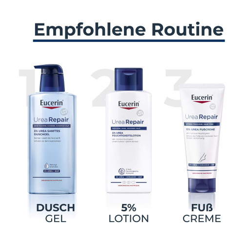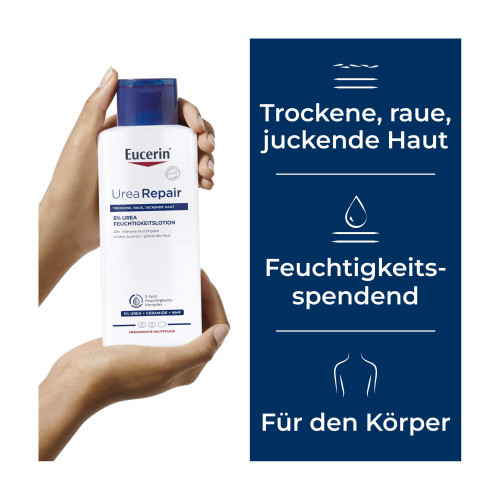 Wenn unsere Haut über eine stabile Barrierefunktion verfügt, schützt sie uns vor dem Eindringen von äußeren Reizstoffen und sorgt so für einen gesunden Feuchtigkeitsgehalt der Haut. Wenn diese Hautbarriere jedoch beschädigt ist, kann Feuchtigkeit aus der Haut entweichen und dadurch trocken aussehen und sich trocken anfühlen. Die Eucerin UreaRepair 5% Urea Feuchtigkeitslotion versorgt trockene, raue Haut mit der täglichen Pflege die sie braucht. Es beinhaltet eine einzigartige Formel mit einem 3-fachem Feuchtigkeits-Komplex – 5% Urea, Ceramide und andere Natürliche Feuchthaltefaktoren (NMF) – für sofortige Linderung von Zeichen rauer, sehr trockener Haut: Rauheit, Juckreiz und Spannungsgefühl.