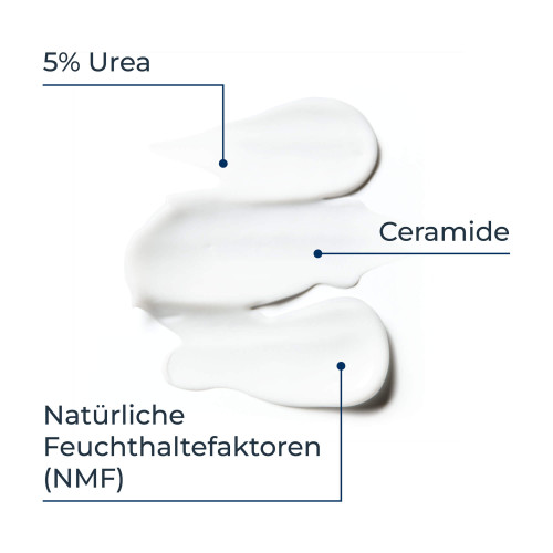Die Hautcreme enthält einen 3-fachen Wirkstoff-Komplex, der Urea mit natürlichen Feuchthaltefaktoren kombiniert. Auf diese Weise wird die Feuchtigkeitsbindung der Haut verbessert und der Feuchtigkeitsgehalt in den oberen Hautschichten deutlich erhöht. Zusätzlich schützen Ceramide die Haut, pflegen sie intensiv und stärken die hauteigene Barriere. Auf diese Weise können Spannungsgefühl, Juckreiz oder eine raue Oberfläche sofort gelindert werden und die Haut wird fühlbar glatt und geschmeidig.