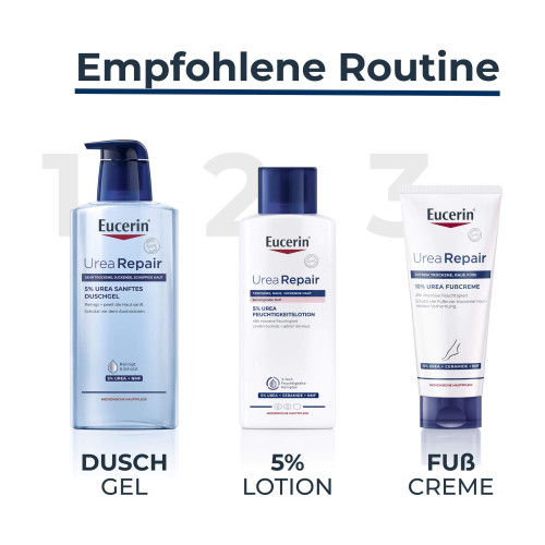 Für beste Ergebnisse die Feuchtigkeitslotion in Kombination mit einer Reinigungspflege für trockene Haut wie Eucerin UreaRepair 5% Urea Sanftes Duschgel (PZN 19166884) verwenden.