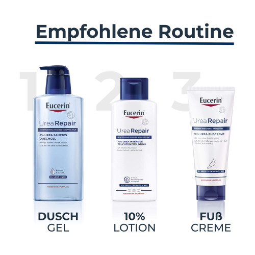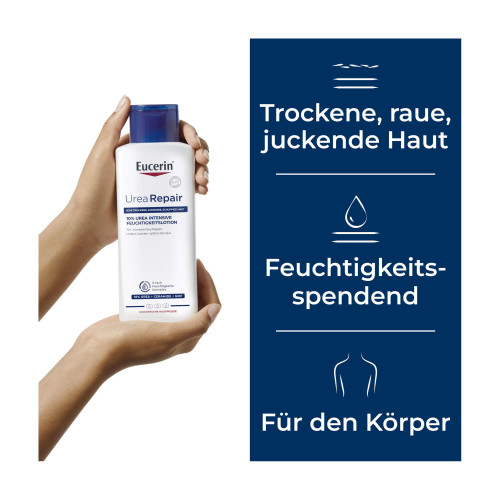 Wenn unsere Haut über eine stabile Barrierefunktion verfügt, schützt sie uns vor dem Eindringen von äußeren Reizstoffen und sorgt so für einen gesunden Feuchtigkeitsgehalt der Haut. Wenn diese Hautbarriere jedoch beschädigt ist, kann Feuchtigkeit aus der Haut entweichen und dadurch trocken aussehen und sich trocken anfühlen. Die Eucerin UreaRepair 10% Urea Intensive Feuchtigkeitslotion versorgt sehr trockene, raue Haut mit der täglichen Pflege die sie braucht. Es beinhaltet eine einzigartige Formel mit einem 3-fachem Feuchtigkeits-Komplex – 10% Urea, Ceramide und andere Natürliche Feuchthaltefaktoren (NMF) – für sofortige Linderung von Zeichen extrem trockener Haut: Juckreiz, Schuppung, Rötung, Rauheit und Spannungsgefühl.