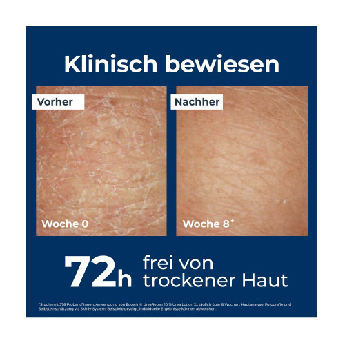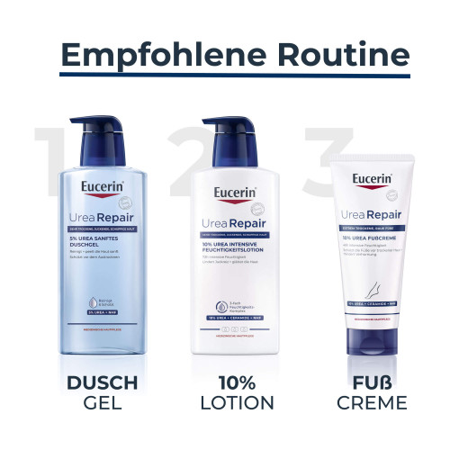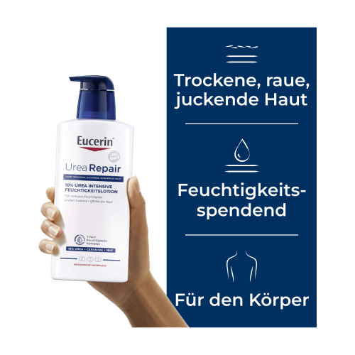 Wenn unsere Haut über eine stabile Barrierefunktion verfügt, schützt sie uns vor dem Eindringen von äußeren Reizstoffen und sorgt so für einen gesunden Feuchtigkeitsgehalt der Haut. Wenn diese Hautbarriere jedoch beschädigt ist, kann Feuchtigkeit aus der Haut entweichen und dadurch trocken aussehen und sich trocken anfühlen. Die Eucerin UreaRepair 10% Urea Intensive Feuchtigkeitslotion versorgt sehr trockene, raue Haut mit der täglichen Pflege die sie braucht. Es beinhaltet eine einzigartige Formel mit einem 3-fachem Feuchtigkeits-Komplex – 10% Urea, Ceramide und andere Natürliche Feuchthaltefaktoren (NMF) – für sofortige Linderung von Zeichen extrem trockener Haut: Juckreiz, Schuppung, Rötung, Rauheit und Spannungsgefühl.
