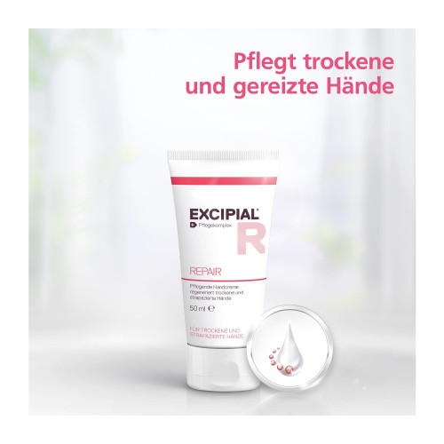 Excipial® Repair mit dem Pflegekomplex aus Nachtkerzensamenöl und Vitamin B3 unterstützt den natürlichen Regenerationsprozess geschädigter Haut. Die pflegende Handcreme zieht schnell ein und glättet trockene und raue Hände.