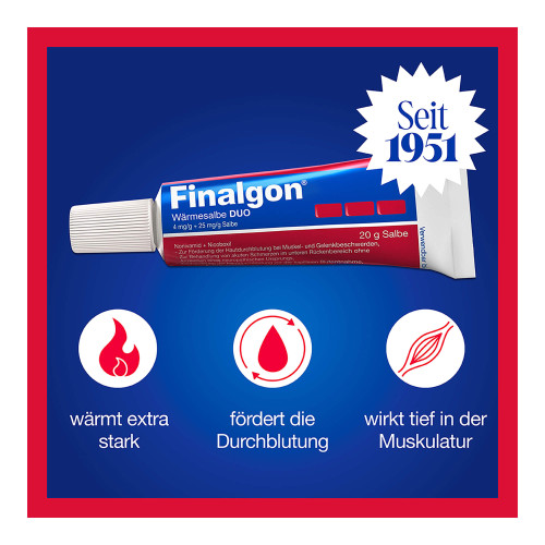 Finalgon Wärmesalbe DUO 4 mg/g + 25 mg/g Salbe. Anwendungsgebiete: Zur Förderung der Hautdurchblutung bei Muskel- und Gelenkbeschwerden; zur Behandlung von akuten Schmerzen im unteren Rückenbereich ohne Anzeichen eines neuropathischen Ursprungs; zur Förderung der Hautdurchblutung vor der kapillaren Blutentnahme, z. B. aus dem Ohrläppchen oder der Fingerkuppe. Warnhinweise: Enthält Sorbinsäure und einen Duftstoff mit Allergenen (3-Methyl-4-(2,6,6-trimethylcyclohex-2-en-1-yl)but-3-en-2-on, Amylcinnamal, Amylcinnamylalkohol, Anisylalkohol, Benzylalkohol, Benzylbenzoat, Benzylcinnamat, Benzylsalicylat, Zimtaldehyd, Cinnamylalkohol, Citral, Citronellol, Cumarin, d-Limonen, Eugenol, Farnesol, Geraniol, Hexylcinnamaldehyd, Hydroxycitronellal, Hydroxymethylpentyl-cyclohexencarboxaldehyd, Isoeugenol, Lilial, Linalool, Methylheptincarbonat, Eichenmoos, Baummoos).