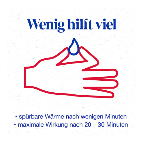 Beginnen Sie die Behandlung mit nicht mehr als 1/2 cm Salbe (etwa Erbsengröße) auf einer handtellergroßen Fläche. Schon kleine Mengen führen zu einem spürbaren wärmenden Effekt, der wenige Minuten nach Anwendung eintritt und seine maximale Wirkung nach 20-30 Minuten erreicht.