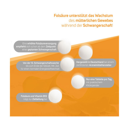 Von der 13. Schwangerschaftswoche bis zum Ende der Stillzeit: Folsäure unterstützt das Wachstum des mütterlichen Gewebes während der Schwangerschaft. Sie leistet, wie Vitamin B12, einen Beitrag zur Zellteilung. Vitamin B12 und Jod tragen zu einem normalen Energiestoffwechsel bei, wobei Vitamin B12 zusätzlich die normale Bildung roter Blutkörperchen unterstützt. Eine erhöhte Folsäureversorgung empfiehlt sich während der gesamten Schwangerschaft bis zum Ende der Stillzeit.