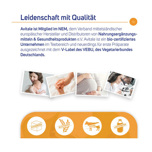 Avitale Folsäure Plus Tabletten sind frei von Gluten, Lactose, Fructose, Farb-und Aromastoffen, Nüssen und Soja sowie tierischen Bestandteilen.