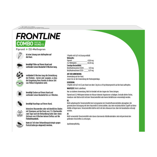 Frontline Combo Spot on Hund S, Lösung zum Auftropfen auf die Haut, für Hunde. Anwendungsgebiete: Zur Behandlung von Hunden mit einem Körpergewicht von über 2 kg bis 10 kg. Gegen Flohbefall, allein oder in Verbindung mit Zecken und/oder Haarlingsbefall. Als Teil einer Behandlungsstrategie zur Behandlung und Kontrolle der Flohstichallergie (FAD).